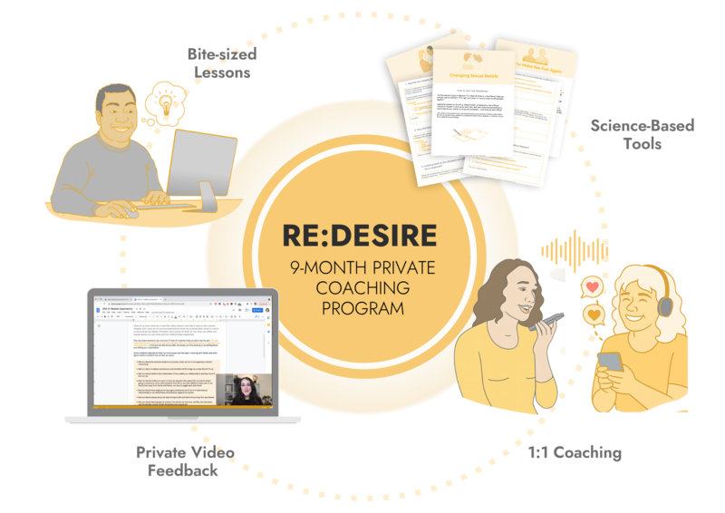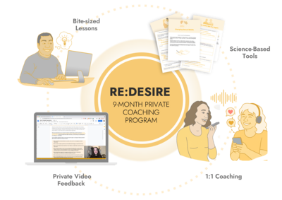 Re:Desire is a 9-month, on-demand desire support program that takes you through my proprietary process "The 5 Phases to Stress-Free Sex & Intimacy". With bite-sized lessons, exercises you can access anytime, anywhere, and weekly 1:1 coaching, this offer is particularly suited to you if you want the whole solution now.